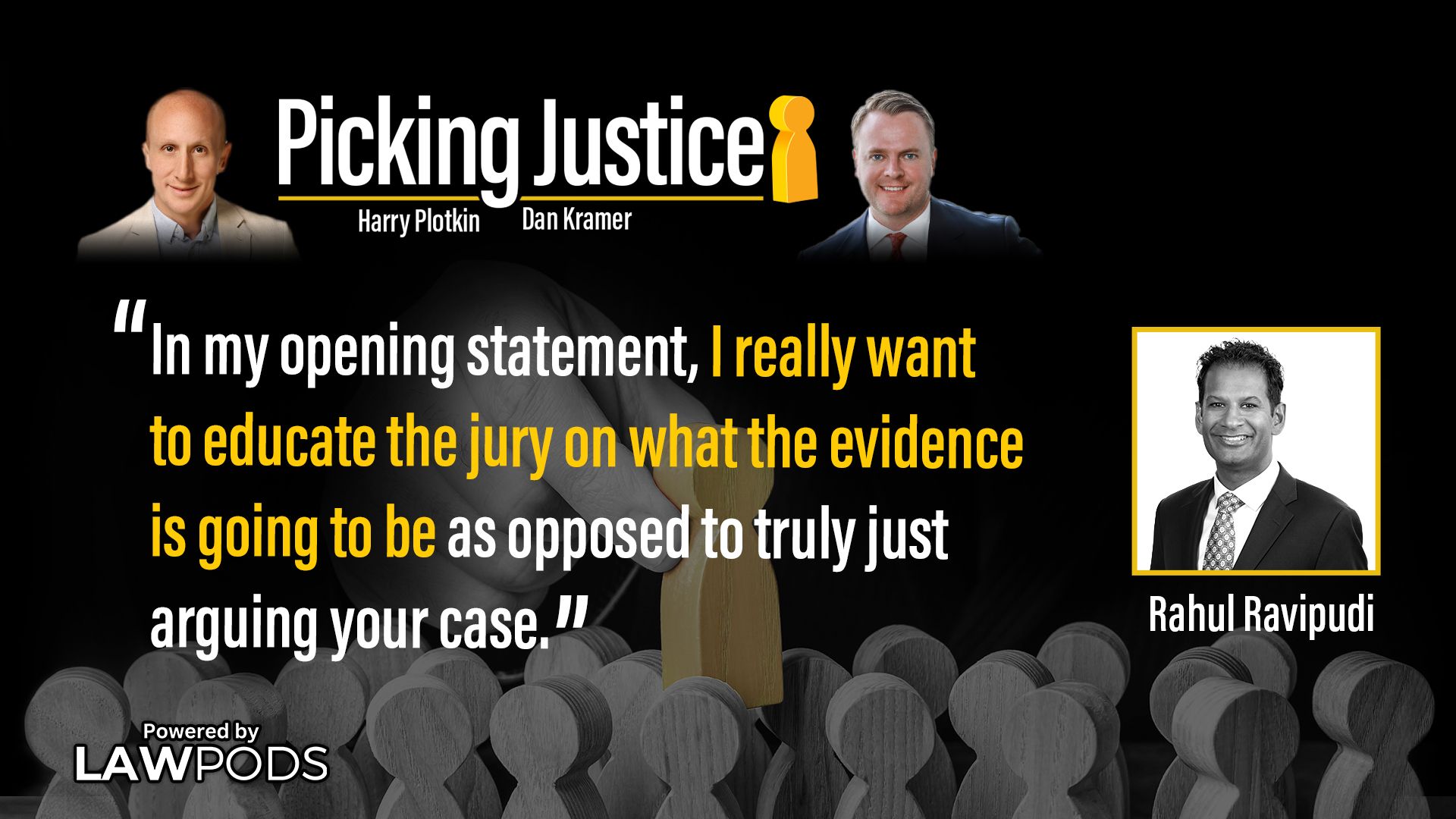 As Rahul explains to Harry and co-host Dan Kramer, his core philosophy is to stick with one voir dire approach. His is identifying juror biases and guiding biased jurors to excuse themselves for cause “or at least allow me to get the cause challenge established.”